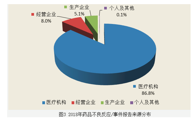 藥品生產企業、經營企業和醫療機構是藥品不良反應報告的責任單位。按照報告來源統計,2018年來自醫療機構的報告占86.8%;來自藥品經營企業的報告占8.0%;來自藥品生產企業的報告占5.1%;來自個人及其他報告者的報告占0.1%(圖3)。
