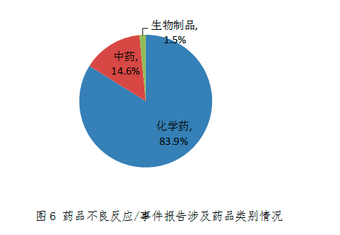 按照懷疑藥品類別統計,化學藥品占83.9%、中藥占14.6%、生物制品占1.5%(圖6)。