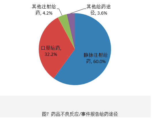 按照藥品給藥途徑統計,2018年藥品不良反應/事件報告中,靜脈注射給藥占60.0%、其他注射給藥占4.2%、口服給藥占32.2%、其他給藥途徑占3.6%(圖7)。