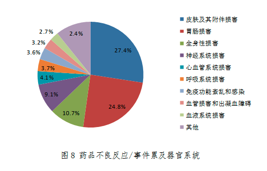 2018年報告的藥品不良反應/事件中,累及器官系統排名前5位的分別為皮膚及其附件損害、胃腸損害、全身性損害、神經系統損害和心血管系統損害(圖8)。