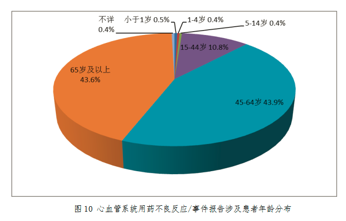 按年齡統計,2018年心血管系統用藥不良反應/事件報告中,45-64歲與65歲及以上年齡組分別占43.9%和43.6%,遠高于其他年齡組比例;嚴重報告中,65歲及以上年齡組占49.9%(圖10)。