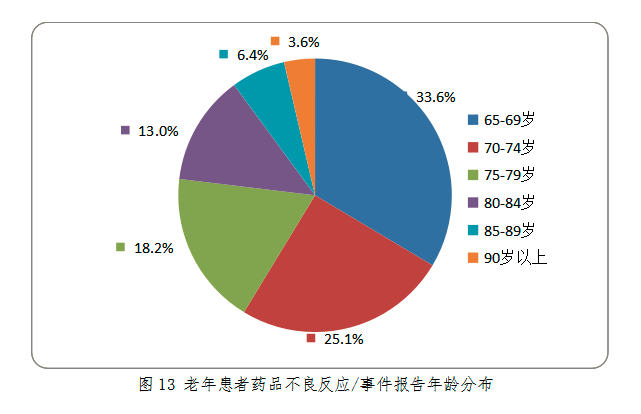 2018年老年患者藥品不良反應/事件報告中,男女患者比為0.96:1。老年患者年齡分布情況, 65-69歲老年患者報告占33.6%,70-74歲老年患者報告占25.1%(圖13)?! ?/span>