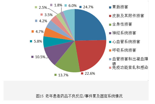 從2018年的統計數據看,在藥品分布上,老年患者用藥的化學藥品中,電解質、酸堿平衡及營養藥、心血管系統用藥、神經系統用藥的構成比高于化學藥總體報告中該分類的構成比,提示老年患者使用以上藥品較多,不良反應發生情況較多。